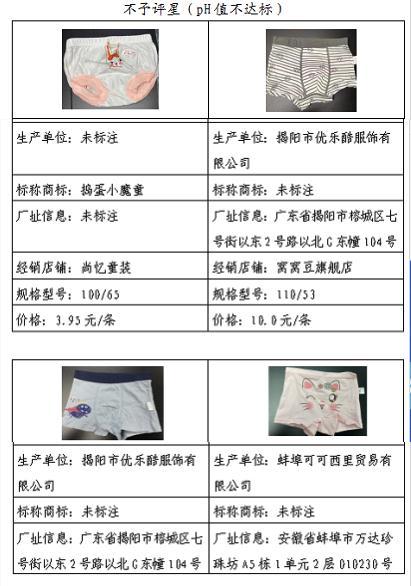 ■6款pH值检测结果不符合国家标准样品分别来自标称“揭阳市优乐酷服饰有限公司”“蚌埠可可西里贸易有限公司”等企业。