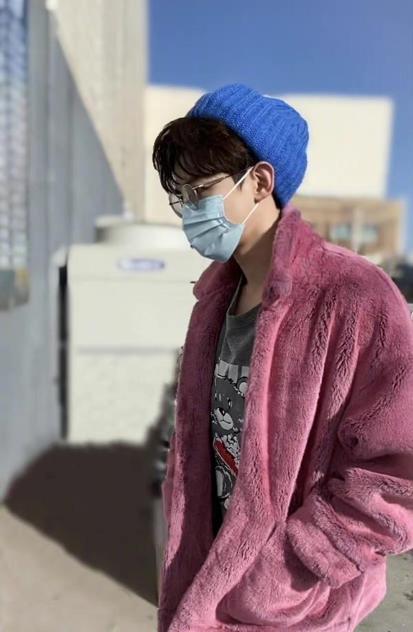 粉色的泰迪熊大衣,短款的长度增加了整身装扮的利落和帅气的感觉,虽然颜色有些闷骚,但是穿在白敬亭身上可是十足的帅气,加上内搭的灰色印花T恤,颜色的高级感就更加的明显了,而白敬亭头上戴着的蓝色针织帽,小巧的尺寸搭配一整身的帅气,也让他看上去可爱了很多。