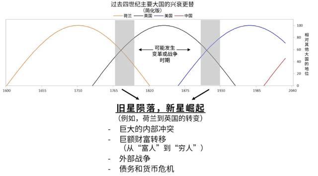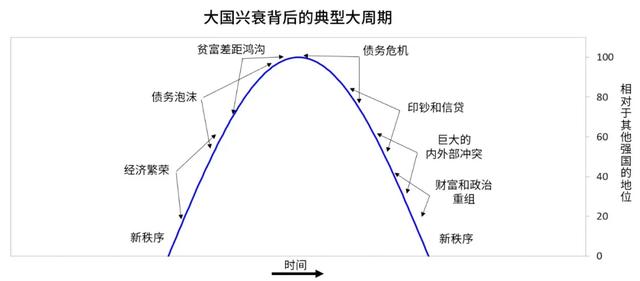 接下来带你了解新秩序创建后的典型大循环。革命和战争之后新秩序——即由新大国主导的新系统——得以创建。例如最后一次世界秩序的创建是在1945年二战结束。周期在此刻存在有支配地位大国,令其他国家无意挑战,所以这段时期通常是和平的,如果管理得当经济会繁荣。这在经济上产生回报,致使人们去借贷并继续押注,从而导致过度负债。由于经济机遇自然分布不均等,造成巨大的贫富差距。此外,随着时间推移,竞争者们出现并发展壮大。过度负债和竞争力下降最终导致金融问题,与此同时巨大的贫富和政治鸿沟出现。这产生更多内部冲突,人们要求更多财富,从而致使政府制造更多债务、大举印钞,这削弱了货币并产生通货膨胀。随着主导大国的衰弱以及其他大国日渐强大到足以挑战它,内外部冲突加剧进而引发变革。旧秩序结束,新秩序开启。这便是正在发生的事。