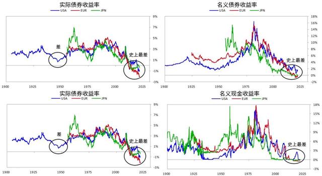 你没有得到利率——为什么你会把钱留在那里?你一定会得到糟糕的利率,特别是对于现金。下方图表显示,无论是通胀调整利率还是名义利率,你基本都会得到有史以来最低利率。