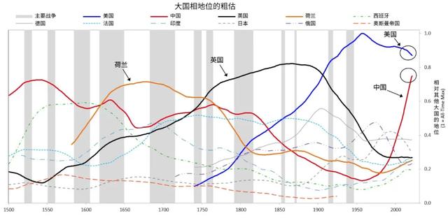下图表显示自1500年以来的大国强弱地位示意图。注意荷兰、英国、美国和中国的周期。当荷兰强盛时荷兰盾是世界储备货币,当英国强盛时英镑是世界储备货币,美国强盛的如今,美元是主要储备货币。注意事情是如何变化的。由于典型的原因这些周期不断变化。
