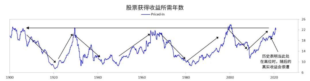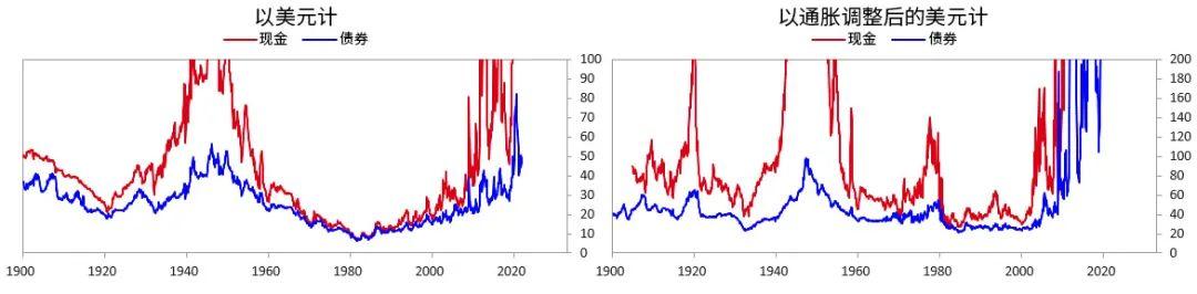 设想一下当下交易。下方图表显示了一个投资者投资于债券和现金后到获得收益所需年数。左上图以美元计,右上图以通胀调整后的美元计。如图所示,投资后到获得收益所需年数在50年到“永无可能”之间。这激发了更多动机去出售和借入债务,而非购买更多。同时,更多债务会产生并不得不被卖出。没有足够需求去购入这些债务,特别是在国际投资者已过量持有的情况下。解决办法是美联储大举印钞并大量购入债务。