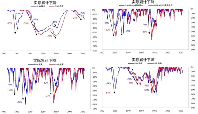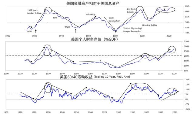 通过创造大量货币和债务的方式使金融资产价格上涨,从而使人们在财务上显得更加富有,但并没有使他们变得真正富有。这也引发实际收益不佳的时期,展示在以下图表中。上方图表显示了金融资产占总资产的比例,第二图表显示财务净值相对于GDP的比例,第三图表显示自1910年以来60/40股债投资组合的滚动收益。