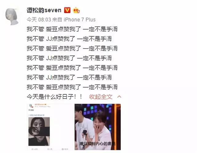 谭松韵的偶像是林俊杰,某次微博被林俊杰点赞之后,谭姑娘就不淡定了,这可是偶像点赞过的微博呢,不管,得让大家都知道。