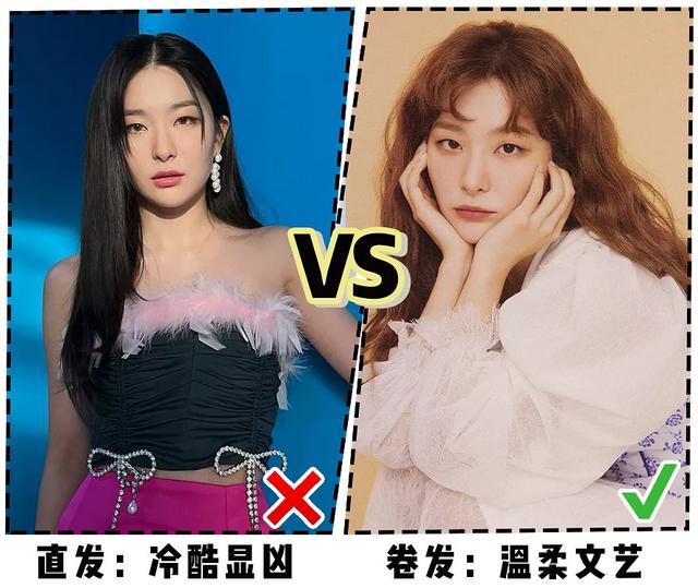 卷发会多一点浪漫柔和的氛围,能把苦相凶相给中和掉。