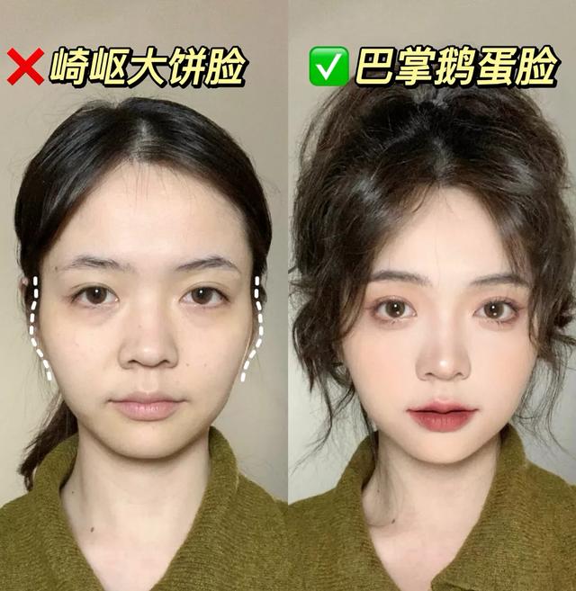 ,把颧骨和太阳穴凹陷的位置遮住,这脸型一下子就变流畅许多。