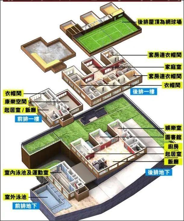 而且布局相当阔气,占地面积有4000平,有健身房、泳池、网球场、后花园,中间层竟然还有个天台农场,实在是颠覆我豪宅的想象。