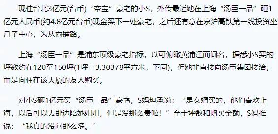 明星们确实都爱在上海买豪宅,小S和老公在2013年的时候就砸下亿元在汤臣一品购下一套350-450平的豪宅,S妈后来有承认。