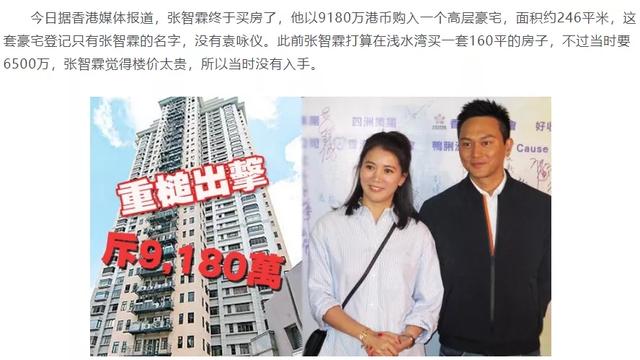 直到2017年张智霖才购入了一套价值9180万港币也就是7400多万人民币的246平的高层豪宅,然而房子登记名字只有张智霖,港媒还爆料此前张智霖打算买一套160平价值5200多万的,因为太贵就没买?
