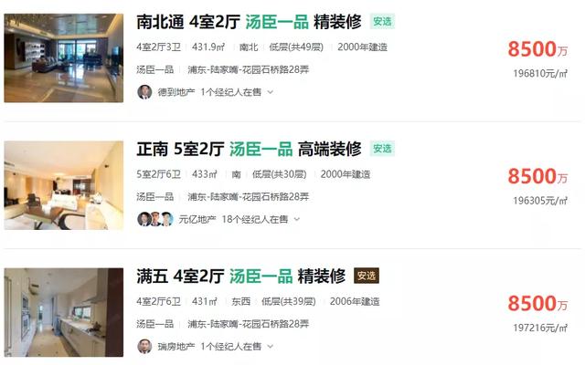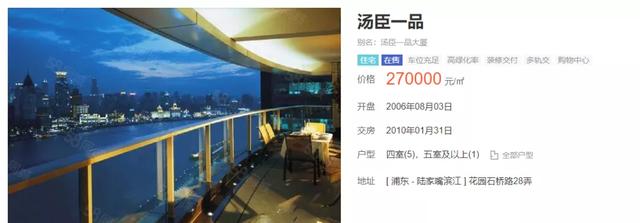 汤臣一品的位置是真的不得了,在黄浦江畔,能看江景能看东方明珠,景观位置一级棒。现如今汤臣一品大小类似的二手房每平19万,仅售8500万左右,新房的价格价值27万每平,400平以上就上亿元了,可以说是很壕的价格了!