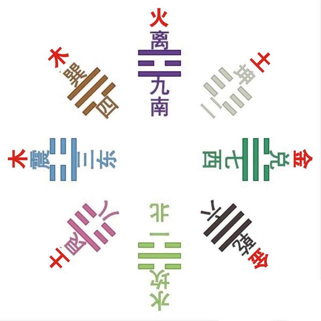乾、兑金;坤、艮土;震、巽木;坎水;离火。