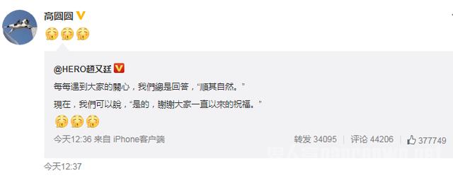 4月8日,赵又廷发微博表示:是的,谢谢大家一直以来的祝福!这是官宣高圆圆怀孕了吗?随后,高圆圆第一个转发了赵又廷的微博,证实怀孕消息,并配以三个鼓掌的表情。看来,公布喜讯是两人一起做出的决定。赵又廷父亲赵树海也转发了儿子这条微博,开心道谢:“谢谢大家的关心与祝福!赵家有喜同欢欣,迎接又圆的结晶。”