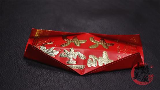3、折好以后的红包,我们还要把他角的背面,都粘上双面胶,并将红包角的角与角之间,全部粘连在一起。