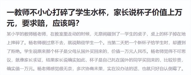 一位教师,在教室里上课,不小心把学生放在桌子上的水杯碰到了地上。老师看到了,表示了道歉,并且告诉孩子,自己赔一个给他。当老师买了一个给孩子的时候,孩子的一句话,让老师震惊不已——他的一个水杯就是一万元。