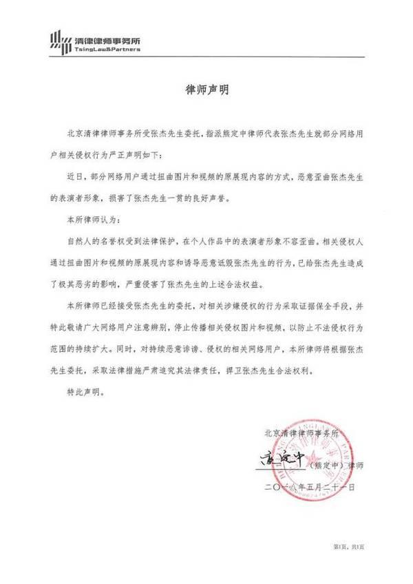 声明中称,自然人的名誉权受到法律保护,在个人作品中的表演者形象不容歪曲。相关侵权人通过扭曲图片和视频的原展现内容和诱导恶意诋毁张杰的行为,给他造成了及其恶劣的影响,严重侵害了张杰的合法权益。并提醒网络用户注意辨别,停止传播相关侵权图片和视频,防止不法侵权行为持续扩大。同时对恶意诽谤、侵权的相关网络用户,将采取法律措施严肃追究其法律责任,捍卫张杰的合法权利。