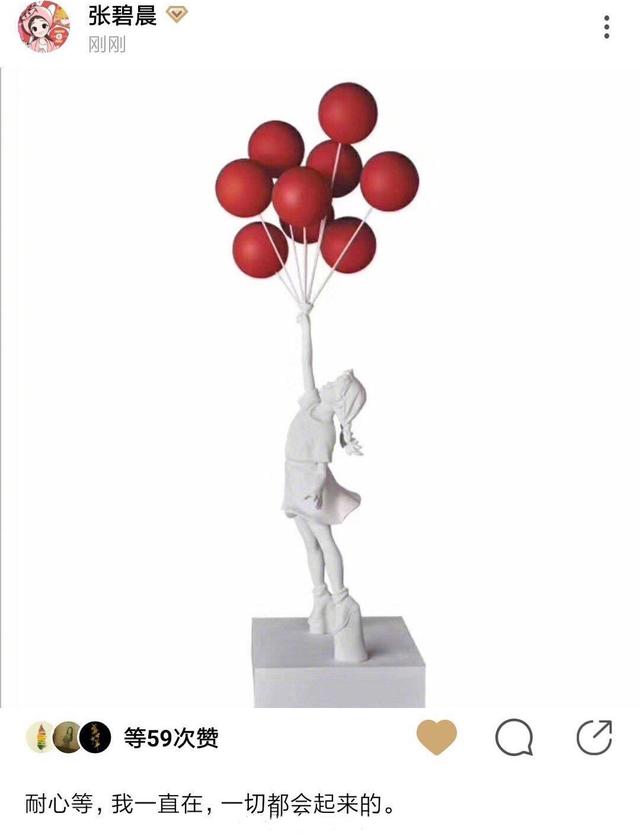 就在华晨宇发文不久,张碧晨也在社交平台发了一则心灵鸡汤式的动态。配图一张小女孩手拿红气球的图片,并配文:"耐心等,我一直在,一切都会起来的。"这一暖心发言,也被疑似是在回应华晨宇的文字,给其加油打气。