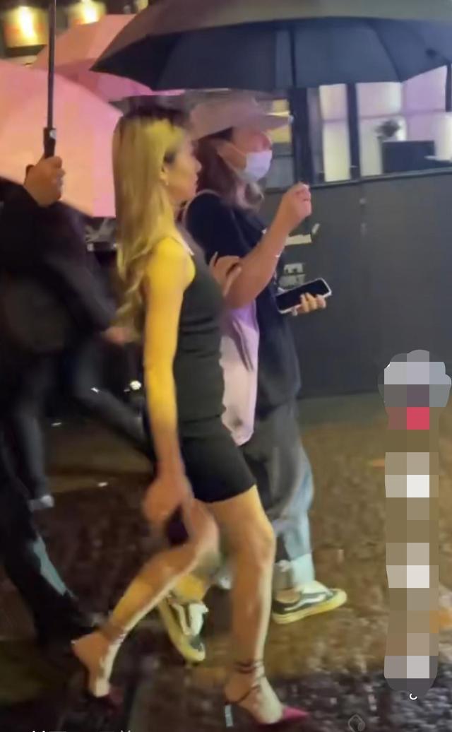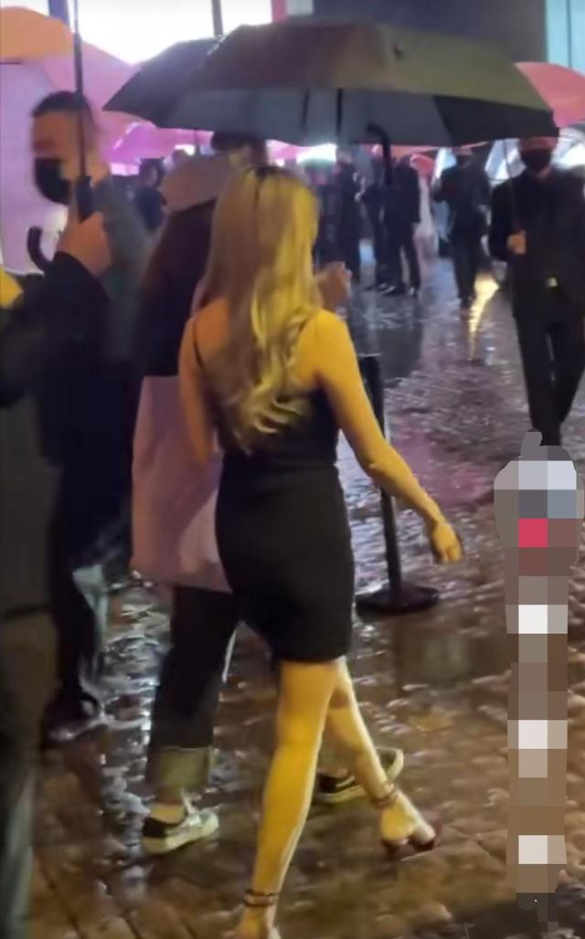 由于是晚上,还下着小雨,地上有一点积水。程晓玥身边跟着两个工作人员,撑着雨伞给她遮雨。可能是穿高跟鞋走路不太方便,程晓玥全程都扶着身边的工作人员。