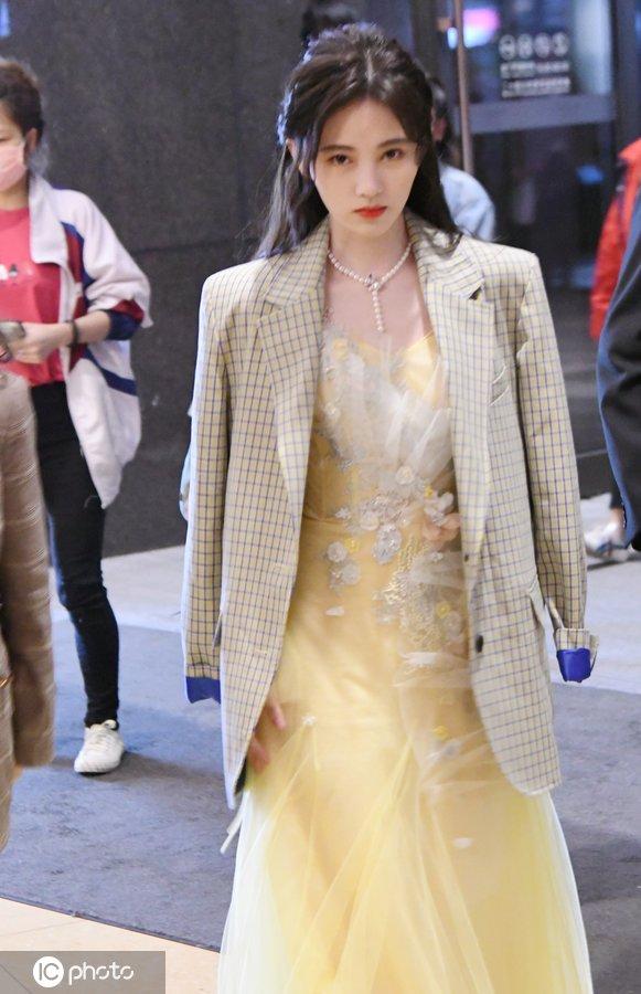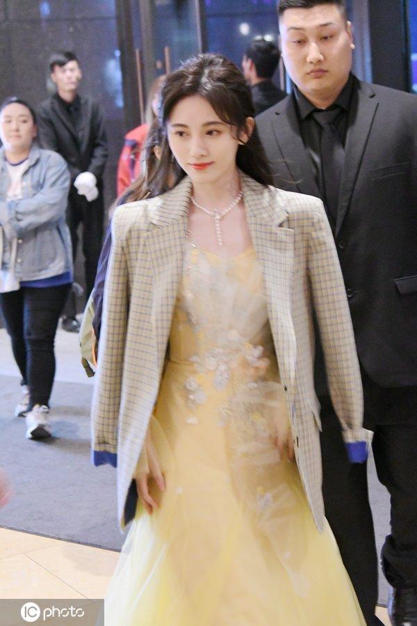 她一袭淡黄色礼服现身,仙气十足的模样超级可人。