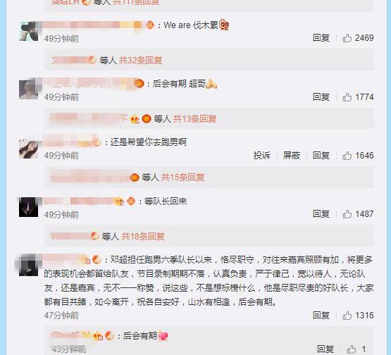 粉丝纷纷表示不舍,随后队长邓超发千字长微博依依惜别这个跑了五年的节目,相当感人。邓超表示因为电影的原因自己暂别跑男,但会继续为队友加油。