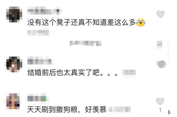 网友看到这一视频后纷纷调侃道没有这个凳子还真不知道王祖蓝的身高差这么多,也有人称结婚前后也太真实了,不过夫妻俩撒狗粮也太让人羡慕了。