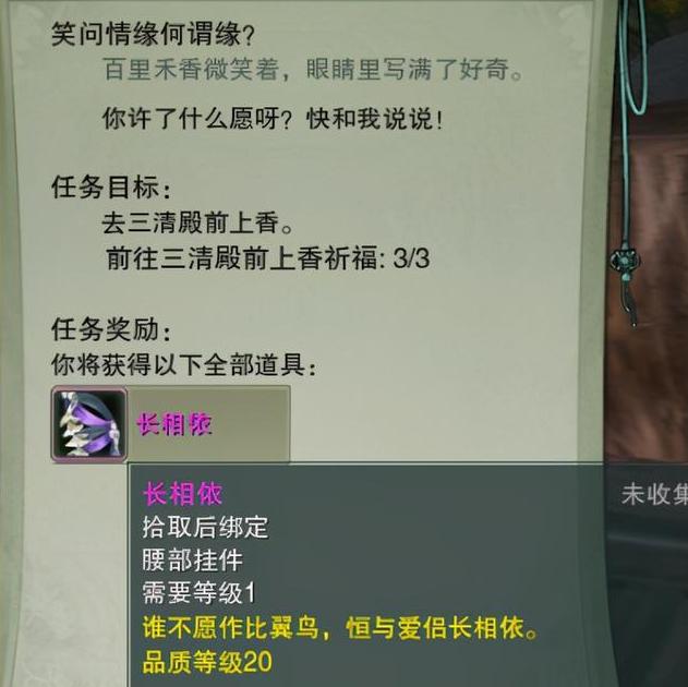 玩家来到百里禾香这,在坐忘峰触发一个新的支线任务,在三清殿为这两人进行祈福,就能够获得一个挂件长相依,而且也将改变他们两人后续会触发一个新的奇遇从而改变故事的悲剧路线。