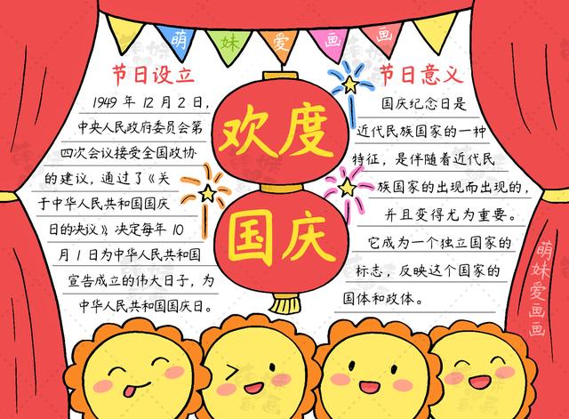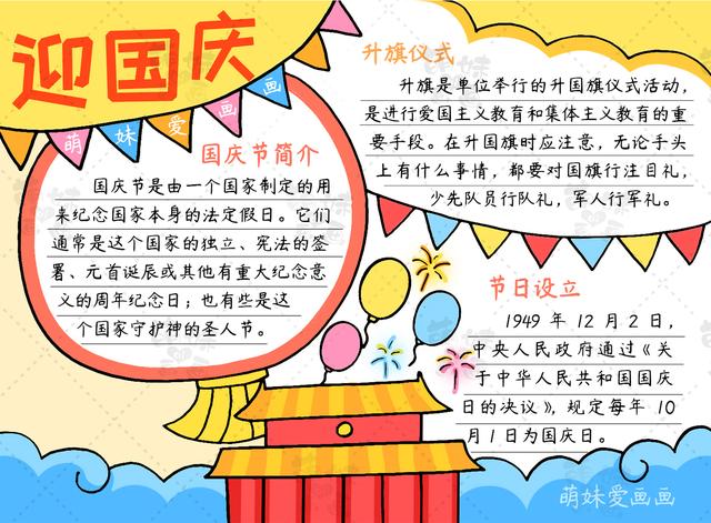 国庆节这一天,各国都要举行不同形式的庆祝活动,以加强本国人民的爱国意识,增强国家的凝聚力。今天就和萌妹老师一起学画含内容文字的国庆节手抄报以及简笔画主题合集,简单又好看,希望能帮助到大家哦!