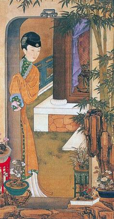 倚门观竹图。庭院中花草竹石满目,并摆放着香兰、月季等各色盆景,争奇斗艳,以婀娜的姿态点缀出俏丽的景致。仕女倚门观望着满园春色,举止间似乎流露着淡淡的叹春情怀。