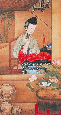 消夏赏蝶图。户外湖石玲珑,彩蝶起舞,萱草含芳。室内仕女手持葫芦倚案静思。此画描绘的虽然是仕女夏日休闲的情景,表达的却是乞生贵子的吉祥意愿。萱草,又名忘忧、鹿葱。《草木记》谓"妇女怀孕,佩其花必生男",因此,它以有助于孕妇生子,又有"宜男萱"之美誉。葫芦,属于生命力旺盛的多籽植物,常被用以喻 "百子"之意。画家巧妙地将萱草与葫芦绘于石侧、掌中,既增加了画面的观赏性,又蕴涵了求子的深意。