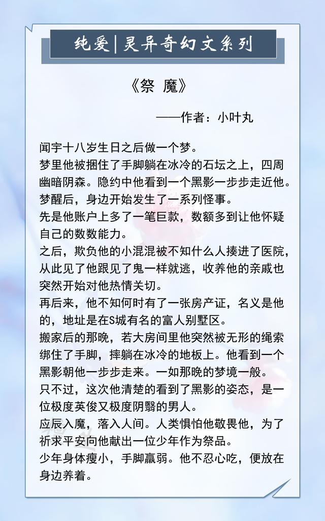 短评:前世缘分今世再续系列。应辰是入了魔的龙,闻宇是他的祭品。开局有点像食物链之间的关系,却渐渐在朝夕相处中演变成救赎关系,只是天道给他们好结局,也就有现代贫穷少年闻宇。闻宇是靠画画为生的高中生,却夜夜受恶梦侵扰,梦中总有一神秘男子纠缠不放,为此他感到苦恼。更让他郁闷的是,神秘应辰从梦里走到了现实,并且以“报恩”为理由塞钱塞房子,最后强势把人塞到了他身边!这篇文整体而言偏灵异风,文笔流畅,个人觉得书荒可撸的水平吧。