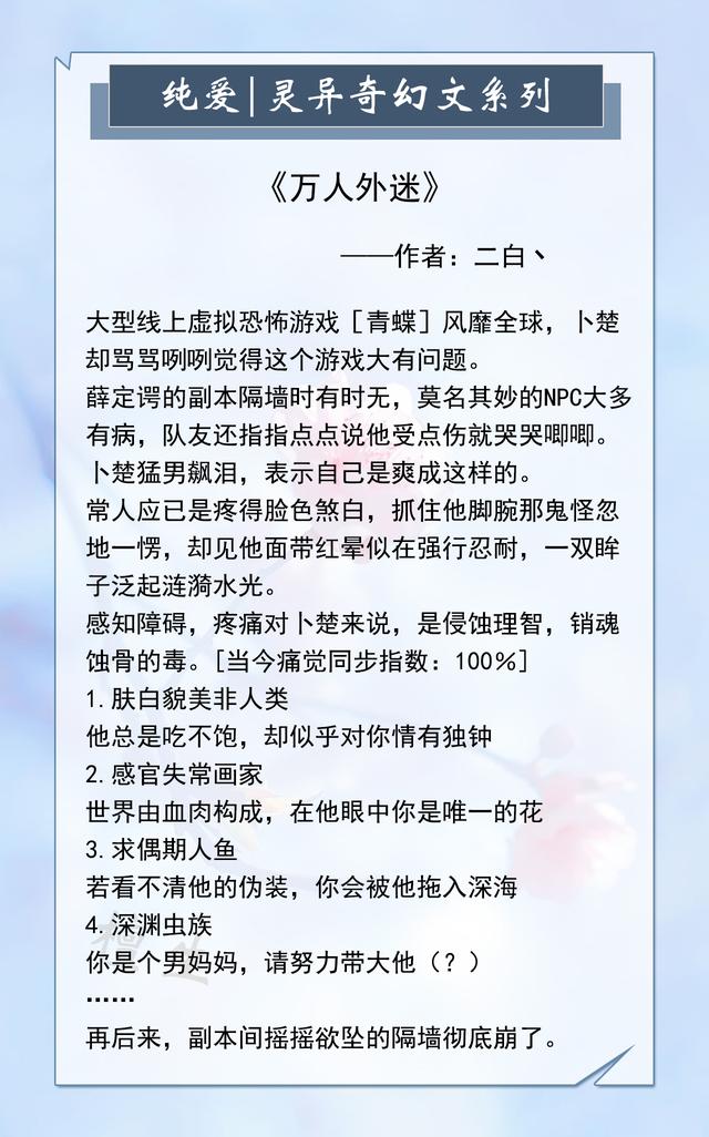 短评:男主卜楚是一个记忆出了问题的游戏玩家,在不知道自己签下什么契约的前提下,凭借信念在凶险万分的游戏中解谜求逃生。由于体质特殊,所有的痛楚到他这里,全转化成极致的快乐,所以战损值越高他就越强。当然,认真走剧情的他,总是在副本里遇到奇奇怪怪的BOSS深情倒贴,他们或偏执或纯情,眼神只追逐着他转动。这篇文现实与游戏之间两个世界剧情贴合流畅,小单元恐怖氛围到位,修罗场营造得不错,只是文字繁琐看得心累。