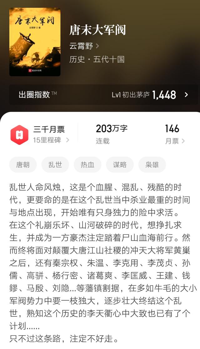2、唐末的局势描写的到位,把唐末军阀混战,武力至上的局势写出来了。