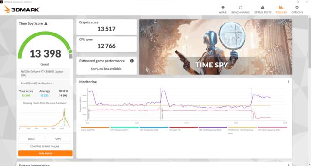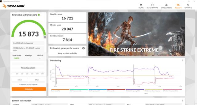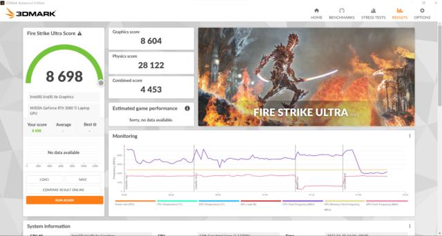 Time Spy DX12测试模式中,其评分13517分;Fire Strike Extreme是通用游戏场景的极限测试模式,评分16721分;Fire Strike Ultra测试结果评分为8604分。其测试成绩表明,用OMEN暗影精灵8Plus玩时下各类游戏都能够在最高画质下获得超过50fps的流畅体验,同时也比市面上有些采用同款显卡的游戏本得分要高,说明OMEN暗影精灵8Plus的散热和做工都非常不错。
