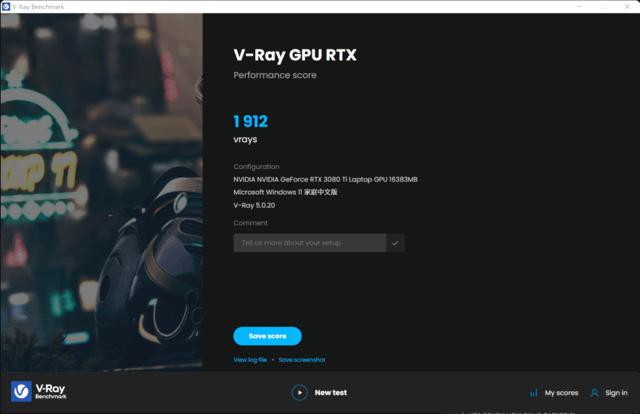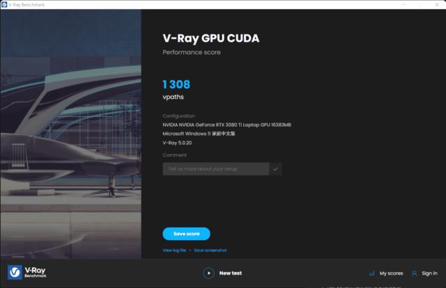 在V-Ray BenchMark的GPU渲染测试部分,这颗RTX 3080Ti Laptop GPU得到了1308 vpaths的分数。而在V-Ray BenchMark的GPU光线追踪测试部分,则得到了1912分。从这两项分数来看,相对于其他品牌搭载RTX 3080Ti显卡的机型,OMEN暗影精灵8Plus的得分也是要高一些的。