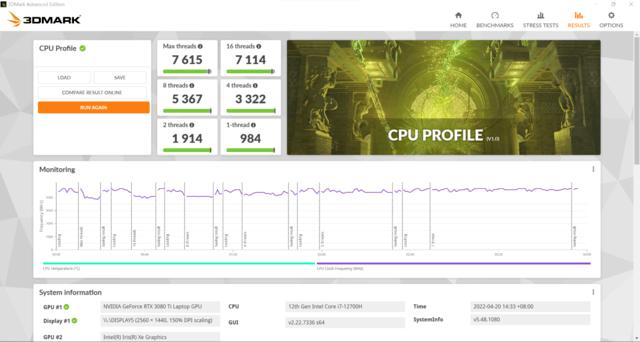 3DMark的CPU PROFILE可以对处理器进行单线程到多线程的全部测试,在这一测试标准下,英特尔12代酷睿i7-12700H处理器单线程得分高达984,2线程得分1914,4线程得分3322,8线程得分5367,16线程得分7114,最大线程数综合得分7615,单线程与多线程性能得分可以看出,运算的速度提升明显。得分代表了笔记本在运行单线程应用或是多线程应用时的运行速度,如此得分,大大节省了用户在应用时的等待时间。