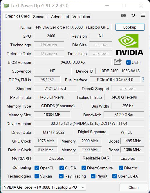 规格方面,RTX 3080Ti笔记本电脑GPU拥有7424个CUDA核心,256bit总线位宽,带宽512GB/s,显存为16GB GDDR6,核心频率1075MHz,显存频率2000MHz,Boost频率1495MHz,规格相对RTX 3070Ti近乎翻倍,性能十分强悍。