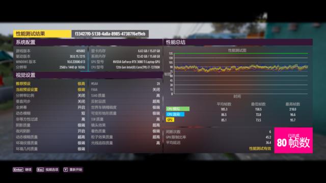 在《地平线5》中,2K分辨率,预设超高画质,运行游戏内置的BenchMark,平均帧数为80帧,游戏可以非常流畅的运行,要知道这种赛车游戏,飙起来只有速度快,才能带来极度的开心感。