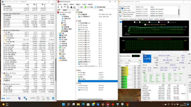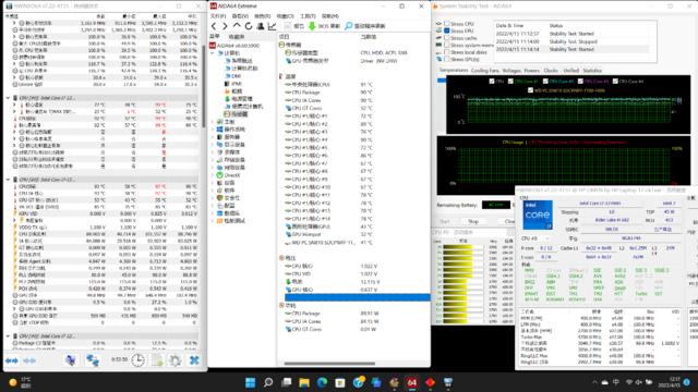 CPU+GPU双烤机测试下,处理器核心温度为94℃,高性能核3.0GHz,高效能核心为2.5GHz。此时其显卡温度为76.9℃,CPU+GPU功耗释放达到69W+155W,CPU与GPU性能均达到最佳状态,整体调校优秀。