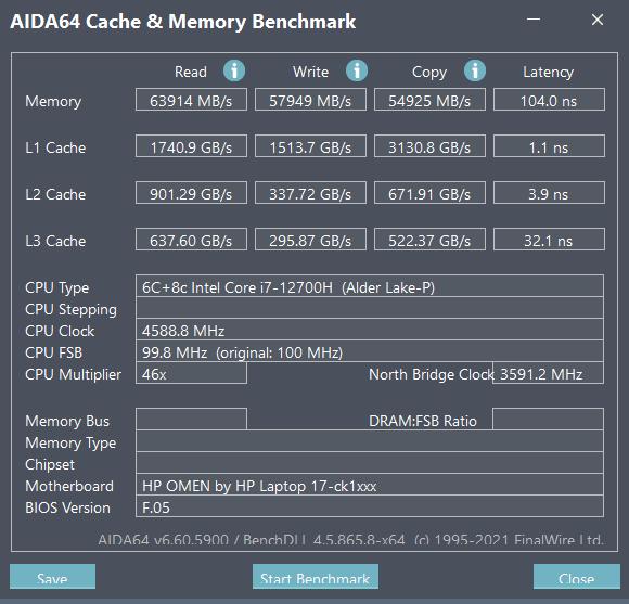 使用AIDA64中的Cache&Memory BenchMark,读、写、复制的速度达到了63914MB/S、57949MB/S、54925MB/S,虽然延迟略高于DDR4时期,但读写和复制的速度有了成倍的提升。