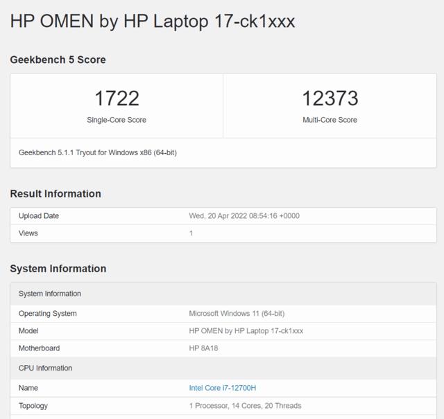 Geekbench 5测试标准下,实测酷睿i7-12700H处理器单核得分1722分,多核得分达到了12373分,相比11代酷睿i7-11800H的多核心成绩9300分而言,多核心方面的性能有了巨大的提升。