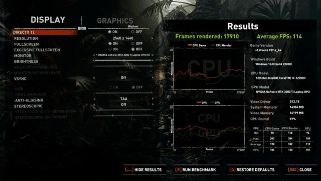 《古墓丽影:暗影》是笔者最喜欢的游戏之一,这种第三人称视角射击类的游戏,总是爱不释手。测试时候,在2K分辨率下,预设最高画质,关闭垂直同步,运行游戏内置的BenchMark,平均帧数为114帧,超过100帧的数据还是令人兴奋的。