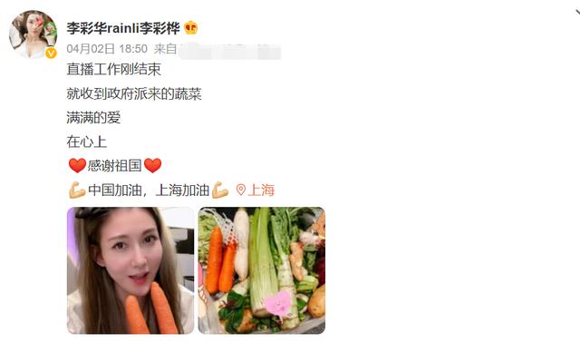 为了表示感谢,李彩桦不仅专门发文,还专门举着两根胡萝卜来了张自拍,照片中李彩桦看起来十分高兴,想来在物资短缺的时候收到这样的补给,喜悦之情溢于言表。