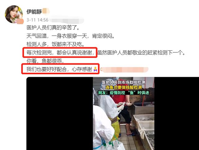 伊能静是一个感性的人,在看到关于疫情的消息时便会忍不住分享。她说自己每次检测完都会认真说谢谢,也呼吁大家要好好配合,心存感谢。