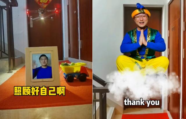 大家以为这个段子就这么结束了吗?沈南用行动告诉大家这不可能,他后来还用视频的方式、扮成阿拉丁神灯的方式,继续上楼找麻烦,可谓是脑洞大开。把自己的隔离生活变得多姿多彩的同时,沈南还给大家传递了快乐,真是一举两得。