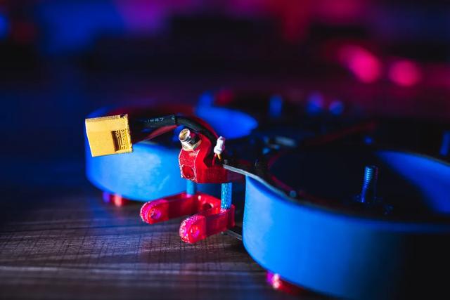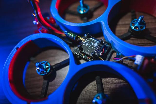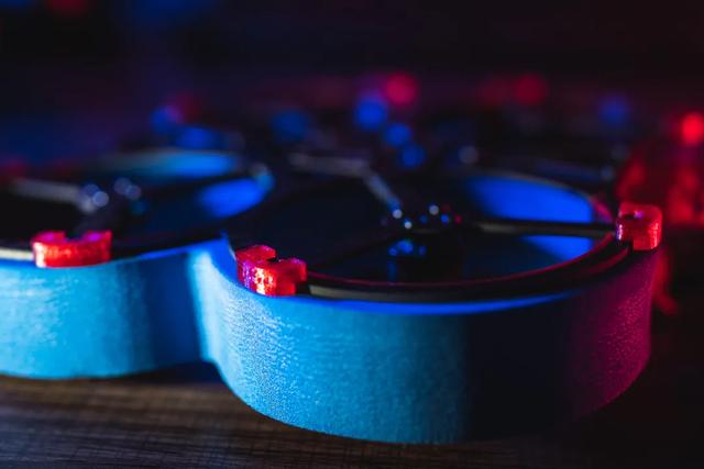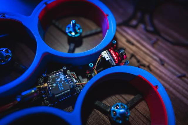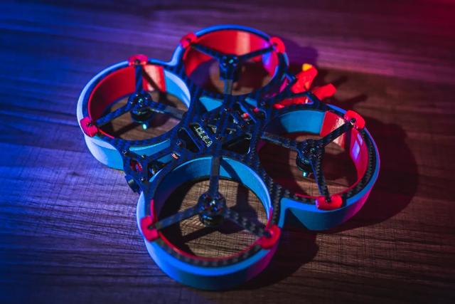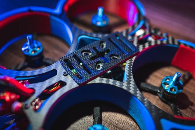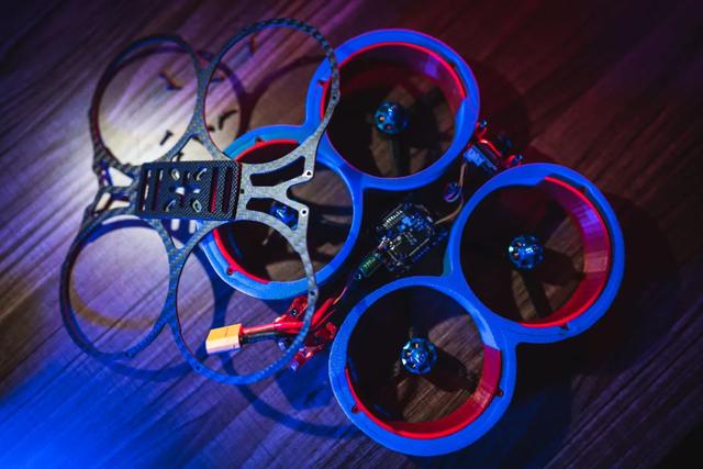 机架蓝色部分为EVA海绵材质,这个设计也是近几个月才广泛应用的,起初是外国大佬用汽车隔音海绵贴在涵道圈外,起到用于吸收机身震动以及撞击时保护机架和被撞物的作用。最近被各厂家做成EVA成品,几乎成了涵道机标配