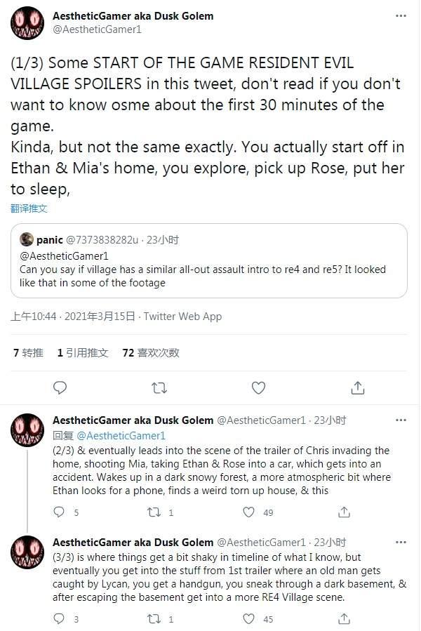 推特用户Dusk Golem曾多次准确爆料了《生化危机》的相关情报。今日,他剧透了一些《生化危机8》开场前30分钟的剧情。玩家问到游戏开场细节,Golem发了三条推文进行了回复。他表示他的爆料并不是和实际游戏一模一样,只是有些相似。如果你想在游戏推出时保持新鲜感,不想知道任何剧情相关内容,那么还是别往下看了比较好。