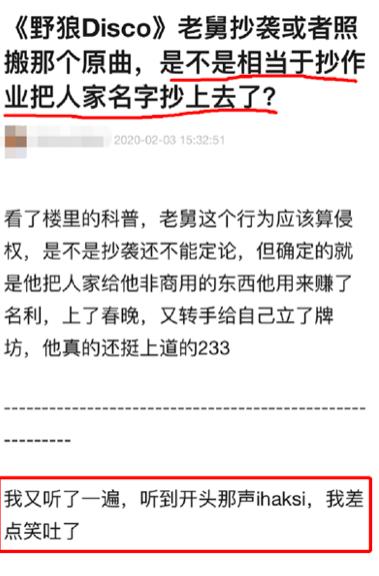 因而有不少网友这才恍然大悟原来《野狼disco》开头中那句低音的“ihsksi”原来就是创作者的名字,他们还纷纷调侃称“老舅”这波操作就相当于是“抄作业还把人家名字抄上去了”。