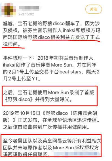 目前,音乐制作人Vilho Ihsksi已授权他人向《野狼disco》的相关利益方发送了正式的律师函,包括飒娱、英皇娱乐、网易云等多家公司在内的涉事方,并要求对方停止使用音乐作品《More Sun》,但是《野狼disco》的版权方团队至今尚未给出任何回复。