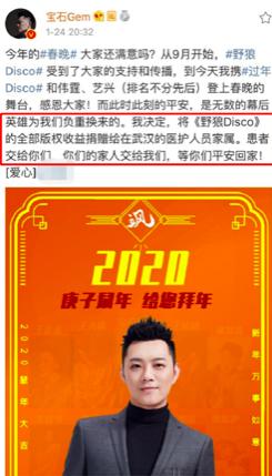 在与陈伟霆、张艺兴几人结束春晚表演的舞台后,董宝石还毅然地做出决定要将《野狼disco》的全部版权收益捐赠给在武汉的医护人员家属。这一行为受到了不少赞誉和好评,在此国难当头,网友们纷纷大力称赞董宝石热心的义举。