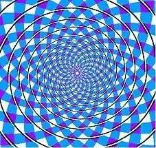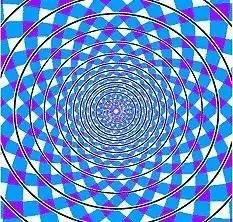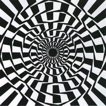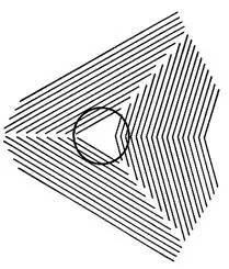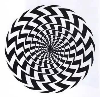 当你看图11时,一定会感觉到是条螺旋线,但当你拿笔沿着线条描下去就会发现,它们是一系列的同心圆。这张图是著名的弗雷泽螺旋错觉,是由英国的心理学家弗雷泽于1908年描绘的。这种错觉主要由图案背景中那些内切于圆并向外微微斜向发散的黑色线条引起的,具有方向性的黑色线条刺激了对方位敏感的视觉细胞,从而诱导产生螺旋错觉。图12是删除诱导线之后的图案,这时错觉已经基本消失。图13与图14均是弗雷泽螺旋的几何变体。
