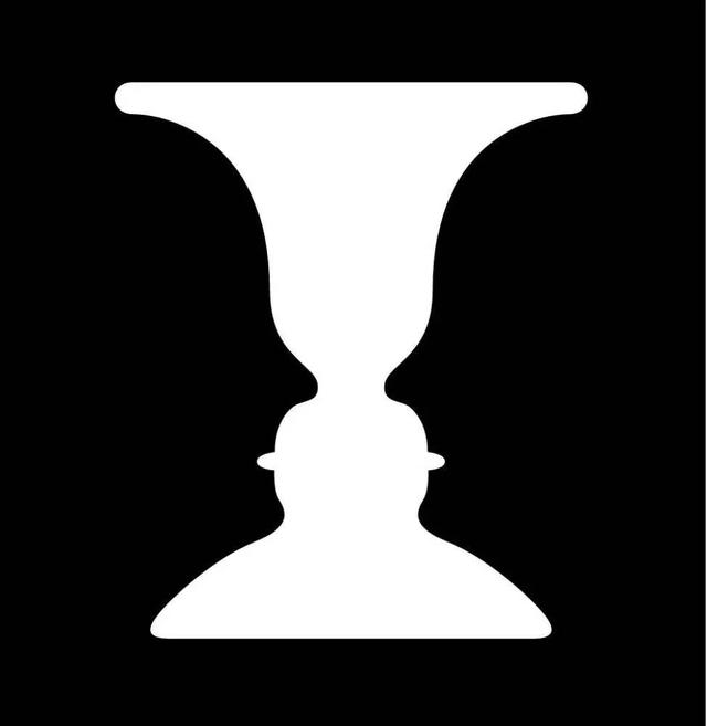 图15你一定见到过,你的视觉也一定会在花瓶的轮廓与两张人的侧面孔之间来回转换。它是丹麦心理学家埃德加·鲁宾于1915年设计的,一般被称作“鲁宾的花瓶”。在花瓶与面孔的视觉转换中,其实是主体与背景之间的变换。如果你选择的是花瓶,那么大脑自然会把面孔作为背景来对待,反之亦然。不过观察者的选择或者对图案的理解与观察者的经验背景有关,如果他对花瓶熟悉,那么在看到的一瞬间大脑会把这一信息传递给视觉系统,从而白色花瓶从黑色背景中分离出来。观察者在这两种图案之间转换并不费力。